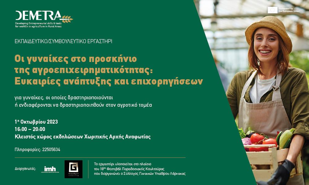 H IMH και η GrantXpert Consulting στο πλαίσιο του ευρωπαϊκού έργου DEMETRA: Developing Entrepreneurial skills & tools for women in agriculTure in Rural Areas, διοργανώνουν εκπαιδευτικό – συμβουλευτικό εργαστήρι για γυναίκες, οι οποίες δραστηριοποιούνται ή ενδιαφέρονται να δραστηριοποιηθούν στον αγροτικό τομέα.