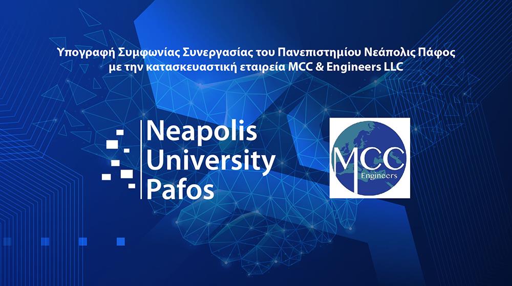 Το Τμήμα Πολιτικών Μηχανικών του Πανεπιστημίου Νεάπολις Πάφος και η εταιρεία MCC & Engineers LLC υπέγραψαν Συμφωνία Συνεργασίας με στόχο την προώθηση της συνεργασίας και της ανταλλαγής γνώσεων στον τομέα της διαχείρισης κατασκευαστικών έργων καθώς και την παροχή ευκαιριών ένταξης των φοιτητών/τριών και αποφοίτων στην αγορά εργασίας.