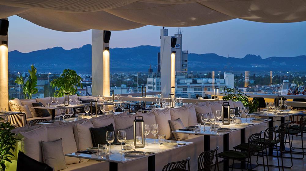 Βρίσκεσαι σε έναν ενιαίο χώρο, με σφαιρική θέα της πρωτεύουσας, που σε καθηλώνει. Σ’ ένα προσεγμένα διακοσμημένο περιβάλλον, με απλές γραμμές και γήινα χρώματα που παραπέμπουν σε καλοκαίρι, με ατμοσφαιρική μουσική από DJ, προσαρμοσμένη αναλόγως με την ώρα.