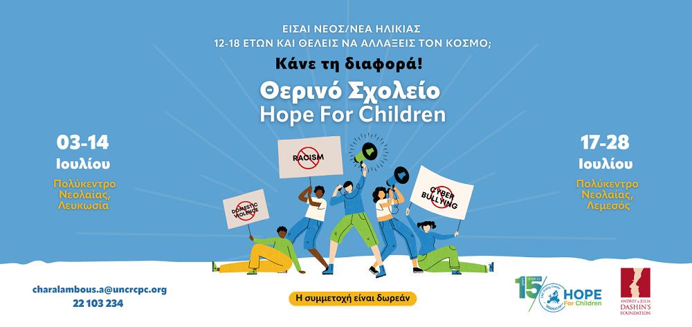 Το «θερινό Σχολείο» του Hope For Children θα έχει διάρκεια 2 εβδομάδων, από τη Δευτέρα 3 Ιουλίου μέχρι την Παρασκευή 14 Ιουλίου, 2023 μεταξύ των ωρών 09:00-15:00 στο «Πολύκεντρο Νεολαίας» στη Λευκωσία και από τη Δευτέρα 17 Ιουλίου μέχρι την Παρασκευή 28 Ιουλίου, 2023, τις ίδιες ώρες, στο «Πολύκεντρο Νεολαίας» στη Λεμεσό. Η συμμετοχή όλων των παιδιών είναι δωρεάν. Κατά τη διάρκεια του προγράμματος θα προσφέρονται στους συμμετέχοντες σνακ και μεσημεριανό γεύμα.