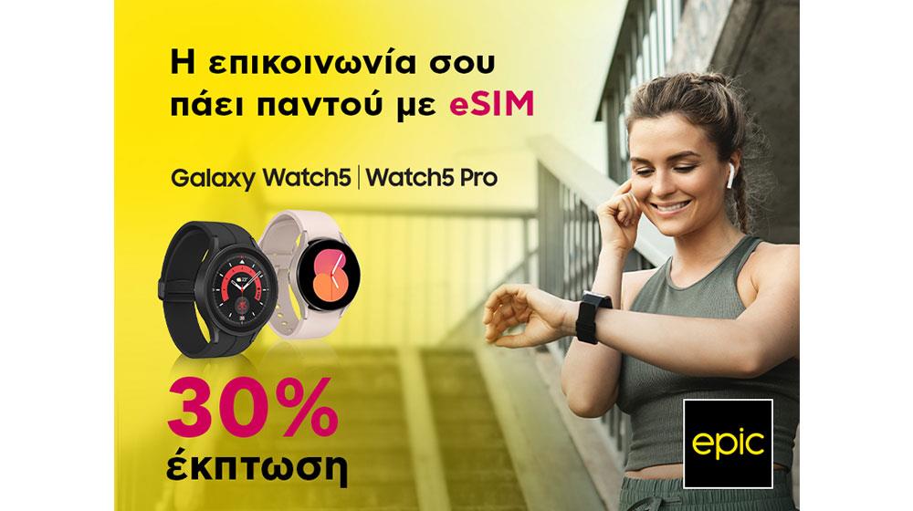 Η Epic σου δίνει την ευκαιρία να αποκτήσεις το Samsung Galaxy Watch5 ή Watch5 PRO μαζί με ηλεκτρονική κάρτα e-SIM με έκπτωση 30%. Η προσφορά ισχύει για υφιστάμενους και νέους συνδρομητές. Επισκέψου ένα από τα καταστήματα της Epic σε ολόκληρη την Κύπρο ή κάλεσε στο 136. Η προσφορά ισχύει μέχρι τις 30 Ιουνίου ή μέχρι εξαντλήσεως των αποθεμάτων.