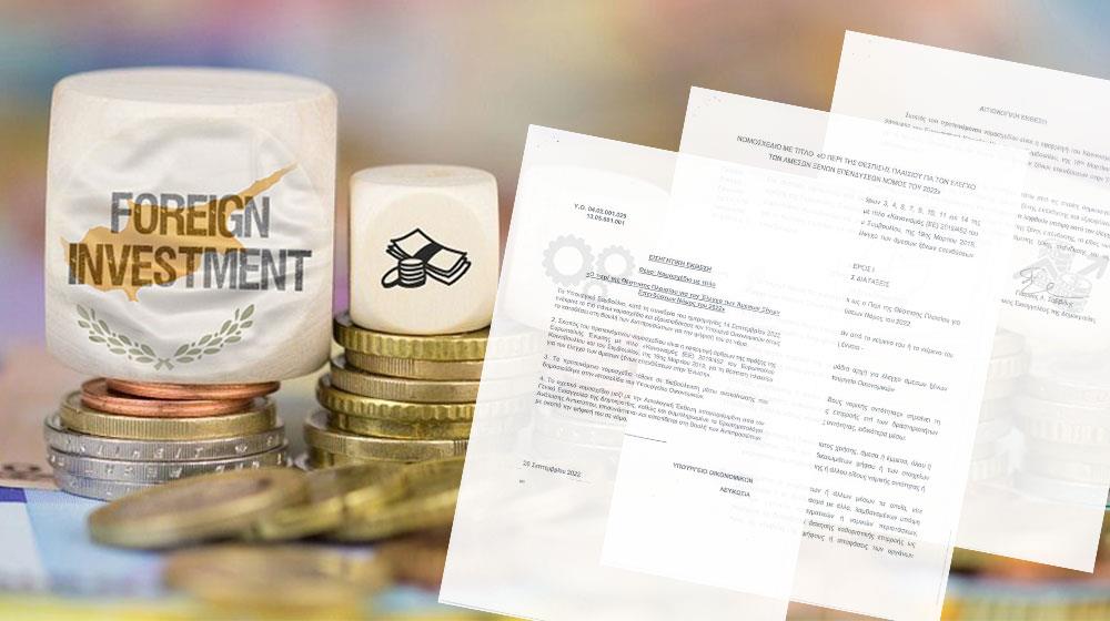 Το αρχικό νομοσχέδιο που κατατέθηκε στη Βουλή φέρει τον τίτλο «Ο περί της Θέσπισης Πλαισίου για τον Έλεγχο των Άμεσων Ξένων Επενδύσεων Νόμος του 2022» και κατά την κατάθεσή του στη Βουλή τον περασμένο Σεπτέμβριο, συνοδευόταν από την αιτιολογική έκθεση, υπογεγραμμένη από τον Γενικό Εισαγγελέα της Δημοκρατίας, καθώς από το συμπληρωμένο ερωτηματολόγιο ανάλυσης αντικτύπου.