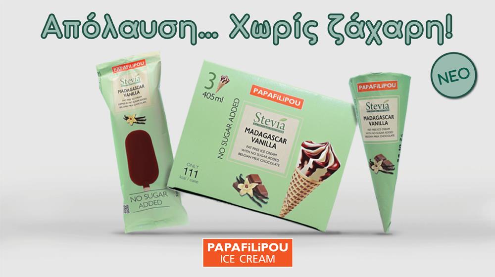 Τα παγωτά PAPAFiLiPOU παράγουν σήμερα 9 παγωτά χωρίς ζάχαρη, με στέβια, σε 21 διαφορετικές συσκευασίες, προσφέροντας πολλές απολαυστικές επιλογές σε όσους προσέχουν τη διατροφή τους.