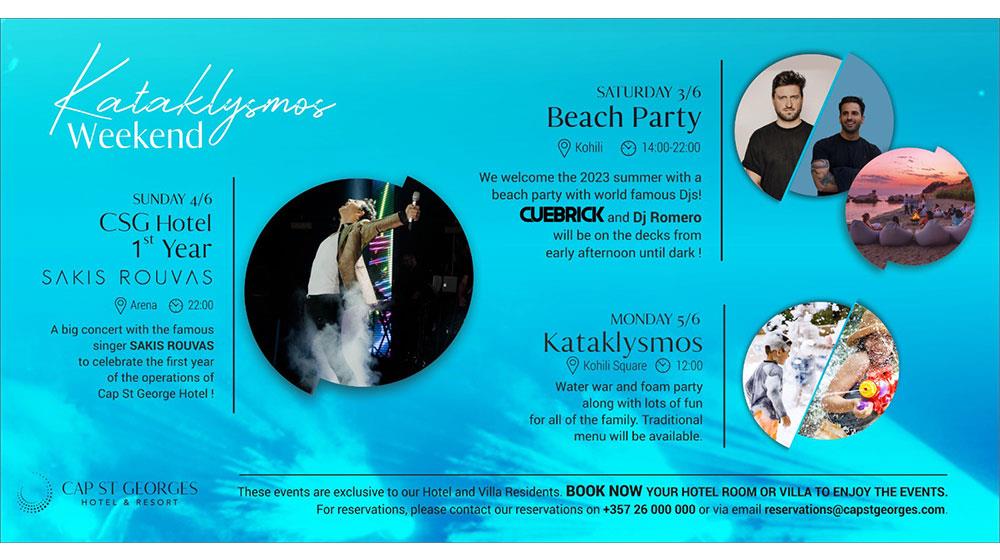 Με ένα φαντασμαγορικό τριήμερο εκδηλώσεων ετοιμάζεται να γιορτάσει το τριήμερο του Κατακλυσμού και να υποδεχθεί το Καλοκαίρι το βραβευμένο τουριστικό θέρετρο Cap St Geogres Hotel & Resort στον Άγιο Γεώργιο Πέγειας.