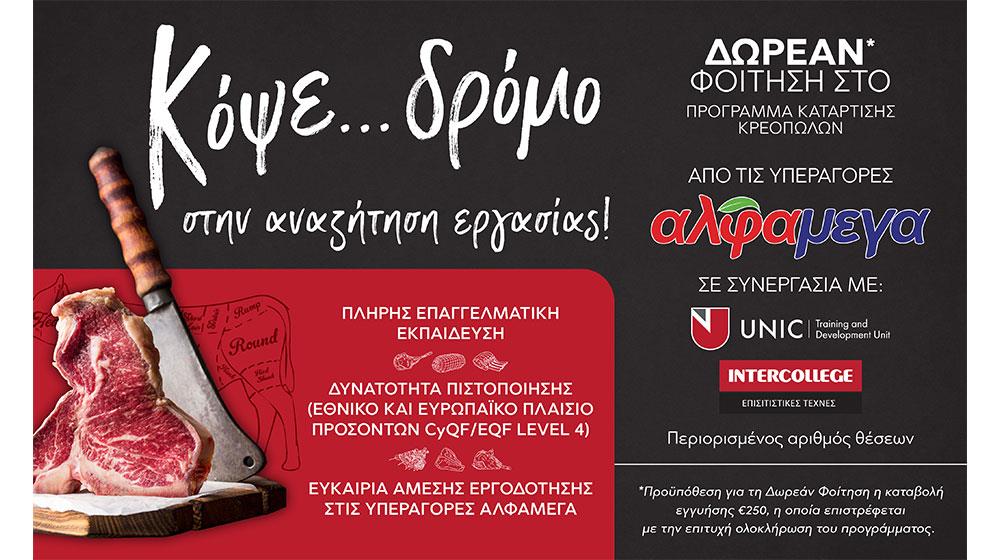 Με στόχο να συμβάλουν στην κάλυψη περισσότερων αναγκών της αγοράς εργασίας και τη διατήρηση του επαγγέλματος του κρεοπώλη, οι τρεις εταίροι δίνουν και φέτος στο κοινό την ευκαιρία να αποκτήσει πολύτιμες γνώσεις και δεξιότητες, με το καινοτόμο Πρόγραμμα Κατάρτισης Κρεοπωλών. Με την επιχορήγηση του προγράμματος, οι Υπεραγορές ΑΛΦΑΜΕΓΑ στηρίζουν την κοινωνία και προσφέρουν μία τεράστια ευκαιρία στους ενδιαφερόμενους να αποκτήσουν τα εφόδια που απαιτούνται για μία νέα καριέρα, χωρίς καμία οικονομική επιβάρυνση.