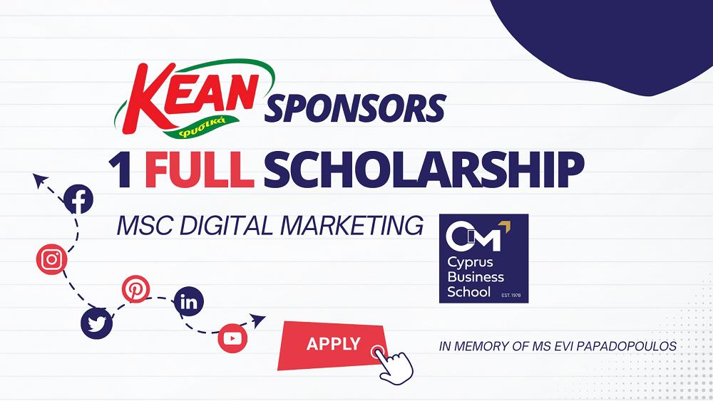 Η Κύπρος χρειάζεται νέους ανθρώπους με όραμα, ταλέντο, δημιουργικότητα και πρωτοποριακές ιδέες. Κι εκείνοι με τη σειρά τους χρειάζονται τα κατάλληλα εργαλεία για να καλλιεργήσουν αυτές τις ικανότητες και τα χαρίσματά τους. Γι’ αυτό και η ΚΕΑΝ, για 5η συνεχόμενη χρονιά, σε συνεργασία με το Cyprus Institute of Marketing (CIM) και το University of West London, προσφέρει σε μαθητή/μαθήτρια μία πλήρη υποτροφία αξίας €8000 για το μεταπτυχιακό πρόγραμμα MSc Digital Marketing, στη μνήμη της εκ των ιδιοκτητών της ΚΕΑΝ, Διευθύντριας Μάρκετινγκ και μέλος του Δ.Σ. της εταιρείας, Εύης Παπαδοπούλου.