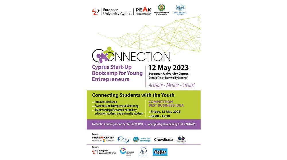 Tο Παιδαγωγικό Ινστιτούτο (Π.Ι.), σε συνεργασία με τις Διευθύνσεις Μέσης Γενικής και Μέσης Τεχνικής και Επαγγελματικής Εκπαίδευσης και Κατάρτισης, τη Σχολή Διοίκησης Επιχειρήσεων του Ευρωπαϊκού Πανεπιστημίου Κύπρου, διά του Performance Enterprise Accelerator and Knowledge Innovation Centre (PEAK), και το Start -up Centre της Microsoft (MIC), διοργανώνει την πρωτοποριακή Ημερίδα Επιχειρηματικής Δημιουργίας 2o Cyprus Start-Up Bootcamp for Young Entrepreneurs, «CONNECTION».