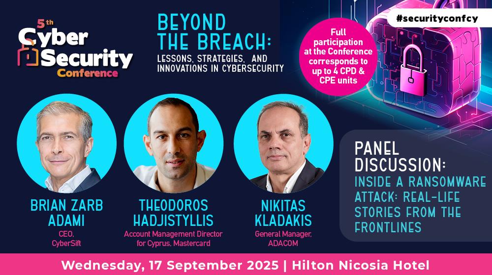 Τις εμπειρίες και την τεχνογνωσία τους θα μοιραστούν οι Brian Zarb Adami, CEO, CyberSift, Θεόδωρος Χατζηστυλλής, Account Management Director για την Κύπρο, Mastercard και Νικήτας Κλαδάκης, General Manager, ADACOM
