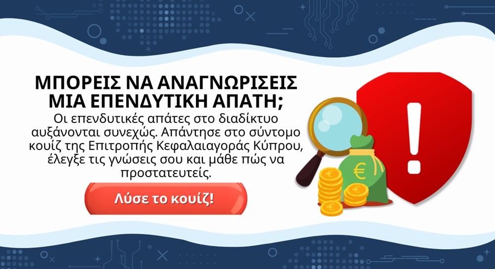 Η Επιτροπή Κεφαλαιαγοράς Κύπρου (ΕΚΚ), στο πλαίσιο των συνεχών προσπαθειών της για επιμόρφωση και προστασία του επενδυτικού κοινού, ετοίμασε ένα νέο κουίζ με στόχο να βοηθήσει τους επενδυτές να αξιολογήσουν το επίπεδο των γνώσεων και την ικανότητά τους να αναγνωρίζουν επενδυτικές διαδικτυακές απάτες.