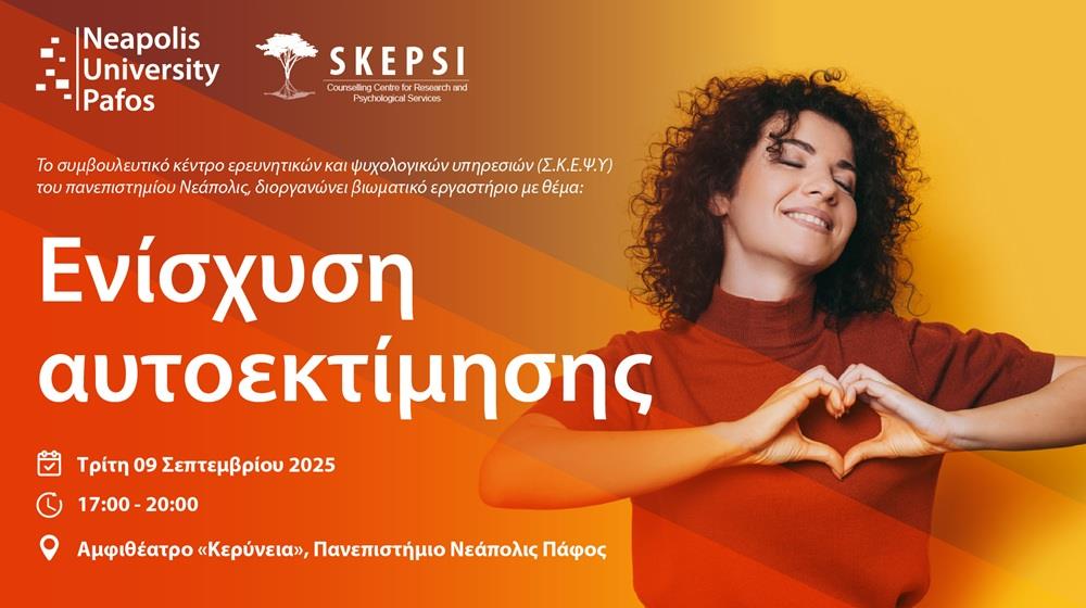 Το Συμβουλευτικό Κέντρο Ερευνητικών και Ψυχολογικών Υπηρεσιών (Σ.Κ.Ε.Ψ.Υ.) του Πανεπιστημίου Νεάπολις Πάφος διοργανώνει την Τρίτη, 9 Σεπτεμβρίου 2025, από τις 17:00 έως τις 20:00, βιωματικό εργαστήριο με τίτλο «Ενίσχυση Αυτοεκτίμησης».