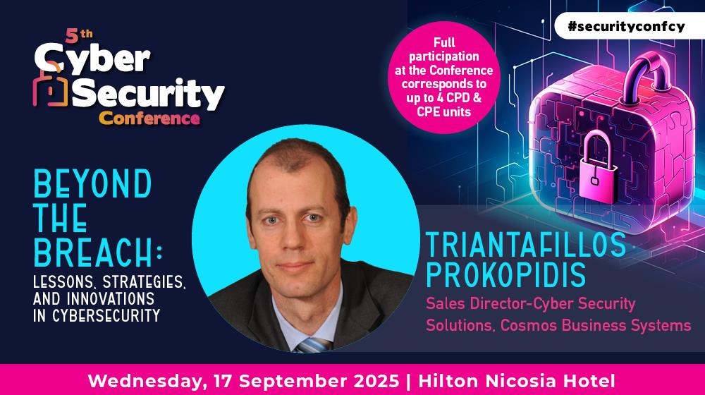 Στο πλαίσιο του 5th Cyber Security Conference, ο Τριαντάφυλλος Προκοπίδης, Sales Director – Cyber Security Solutions, Cosmos Business Systems, θα παρουσιάσει το θέμα: «State-of-the-Art Protection & Compliance»