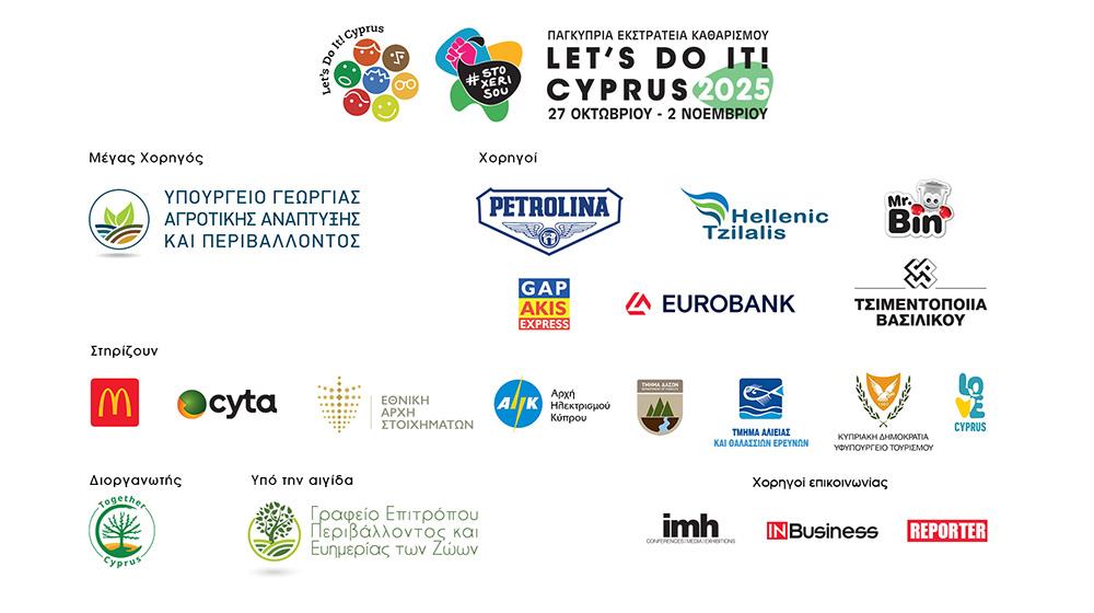 H Πετρολίνα στηρίζει το Let's Do It! Cyprus 2025 ως Πλατινένιος Χορηγός, ενισχύοντας έμπρακτα την προσπάθεια για έναν καθαρότερο τόπο. Αποκλειστικός Χορηγός Επικοινωνίας είναι οι IMΗ, InBusiness και Reporter. Υπόλοιποι Χορηγοί είναι: