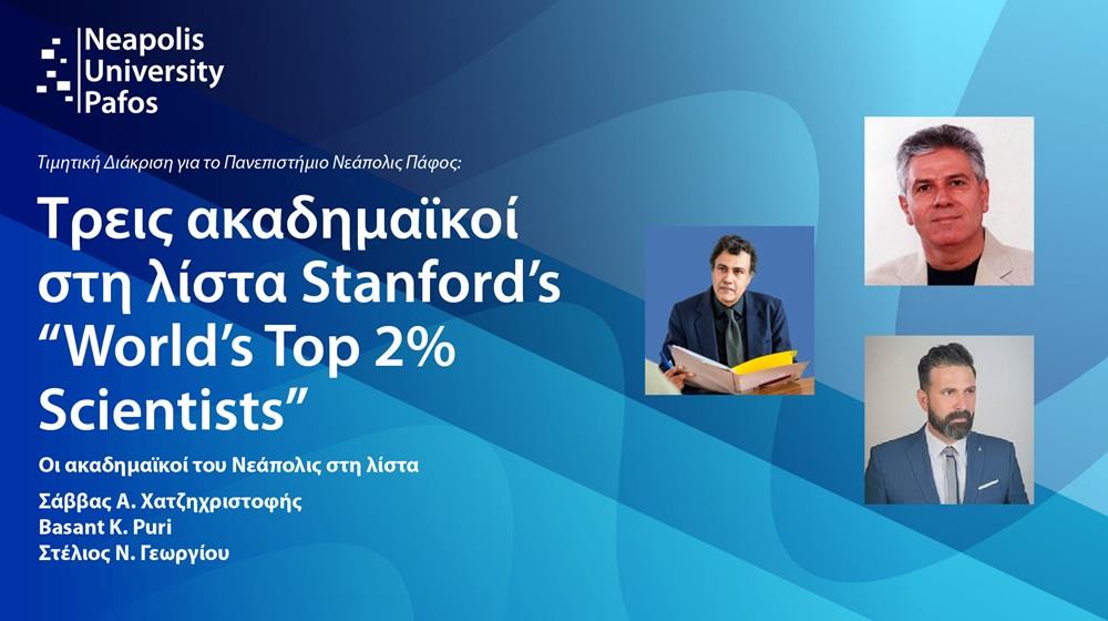 Το Πανεπιστήμιο Νεάπολις Πάφος ανακοινώνει ότι τρεις ακαδημαϊκοί του περιλαμβάνονται στη διεθνώς αναγνωρισμένη λίστα Stanford’s World’s Top 2% Scientists (2025), η οποία συντάσσεται σε συνεργασία με την Elsevier και δημοσιεύεται από την ερευνητική ομάδα του Καθηγητή John Ioannidis.
