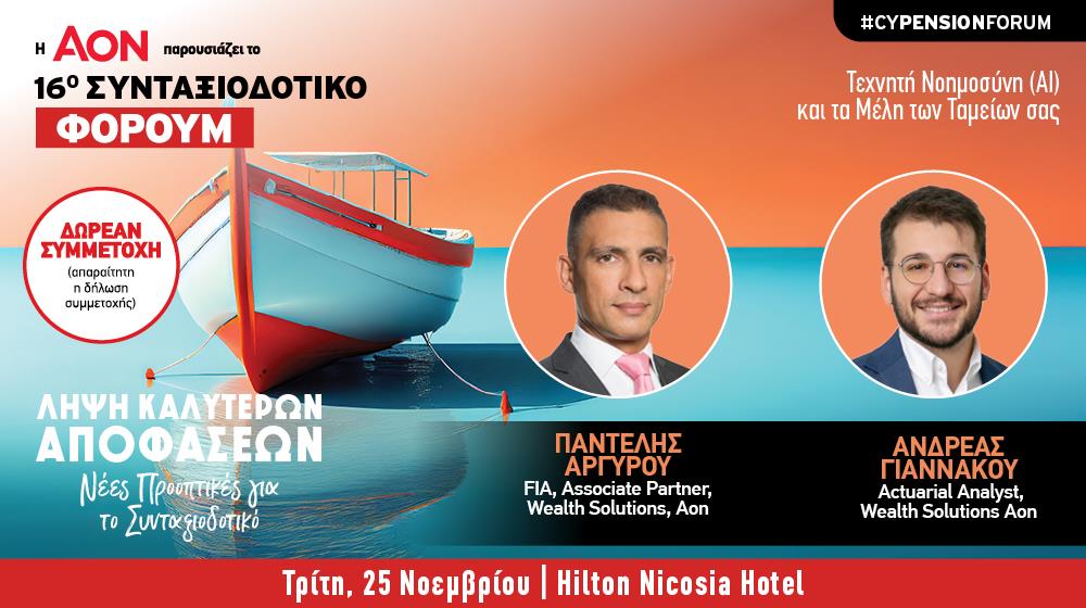 Την παρουσίαση θα πραγματοποιήσουν ο Παντελής Αργυρού, FIA, Associate Partner, Wealth Solutions, Aon, και ο Ανδρέας Γιαννακού, Actuarial Analyst, Wealth Solutions, Aon.