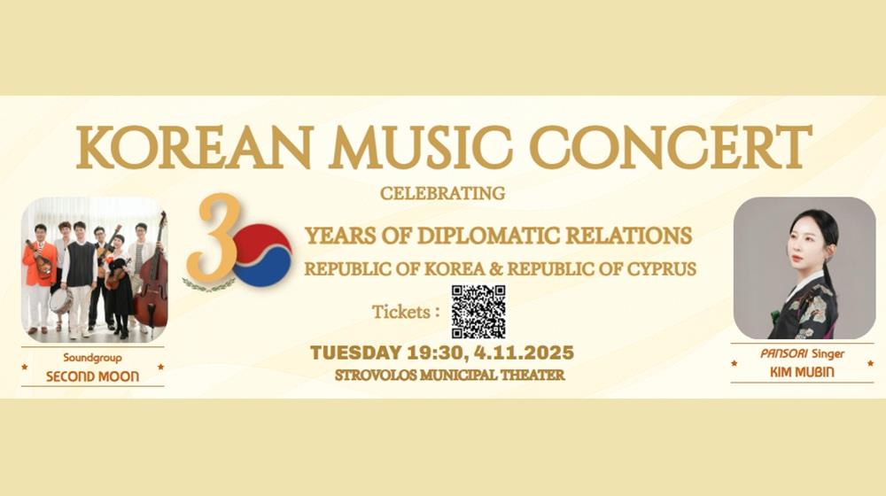 Με την ευκαιρία της 30ής επετείου διπλωματικών σχέσεων μεταξύ της Δημοκρατίας της Κορέας και της Κυπριακής Δημοκρατίας, μια συναυλία κορεατικής μουσικής θα πραγματοποιηθεί την Τρίτη, 4 Νοεμβρίου 2025, στις 7.30 το βράδυ, στο Δημοτικό Θέατρο Στροβόλου.