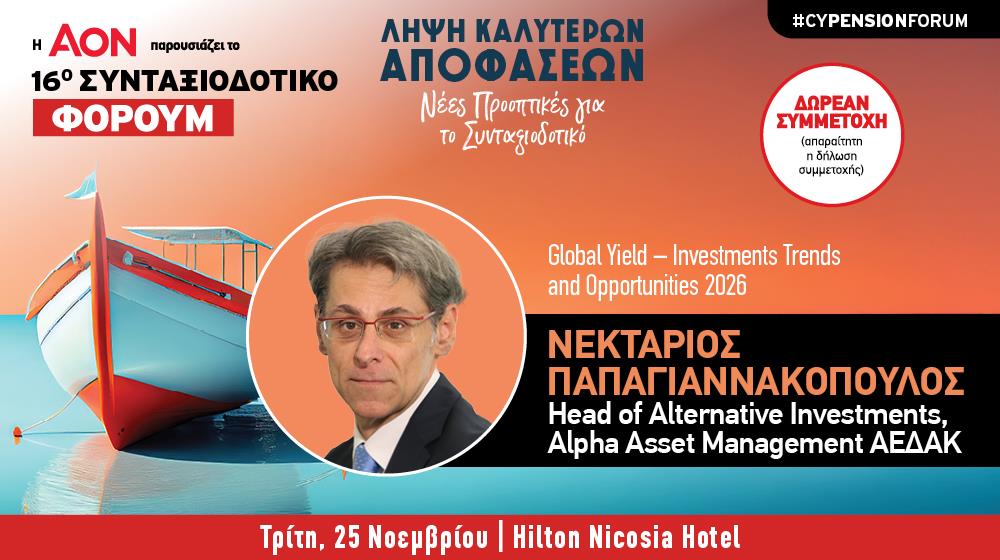 Στο πλαίσιο του 16ου Συνταξιοδοτικού Φόρουμ, ο Νεκτάριος Παπαγιαννακόπουλος, Head of Alternative Investments της Alpha Asset Management ΑΕΔΑΚ, θα προβεί σε μια παρουσίαση με τίτλο «Global Yield – Investment Trends and Opportunities 2026», η οποία θα επικεντρωθεί, ακριβώς, στις παγκόσμιες αποδόσεις και τις νέες τάσεις στις κατηγορίες επενδύσεων. Oι παγκόσμιες τάσεις και επενδυτικές ευκαιρίες θα αποτελέσουν το κύριο αντικείμενο μιας παρουσίασης που αναμένεται με ενδιαφέρον.