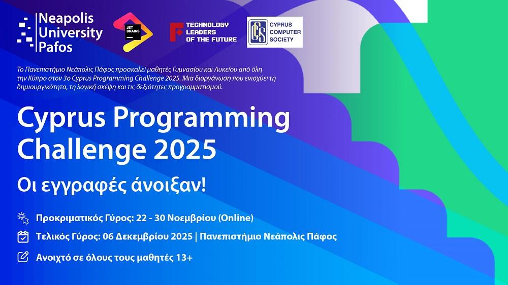 Το Πανεπιστήμιο Νεάπολις Πάφος, σε συνεργασία με τον Cyprus Computer Society, διοργανώνει τον 3ο Cyprus Programming Challenge 2025, μια παγκυπριακή Ολυμπιάδα Προγραμματισμού που απευθύνεται σε μαθητές Γυμνασίου και Λυκείου από όλη την Κύπρο.