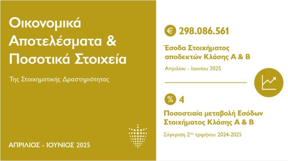 Σύμφωνα με τα στοιχεία για την περίοδο Απριλίου-Ιουνίου 2025, παρατηρείται αύξηση 4% στα μεικτά έσοδα των αποδεκτών Κλάσης Α (επίγειο στοίχημα) και Κλάσης Β (διαδικτυακό στοίχημα), τα οποία ανήλθαν -σε €298.086.561, σε σχέση με την αντίστοιχη περίοδο του 2024 (€287.889.316). Σε σύγκριση με το Β’ τρίμηνο του 2023 (€256.546.057), η αύξηση φτάνει το 16%.