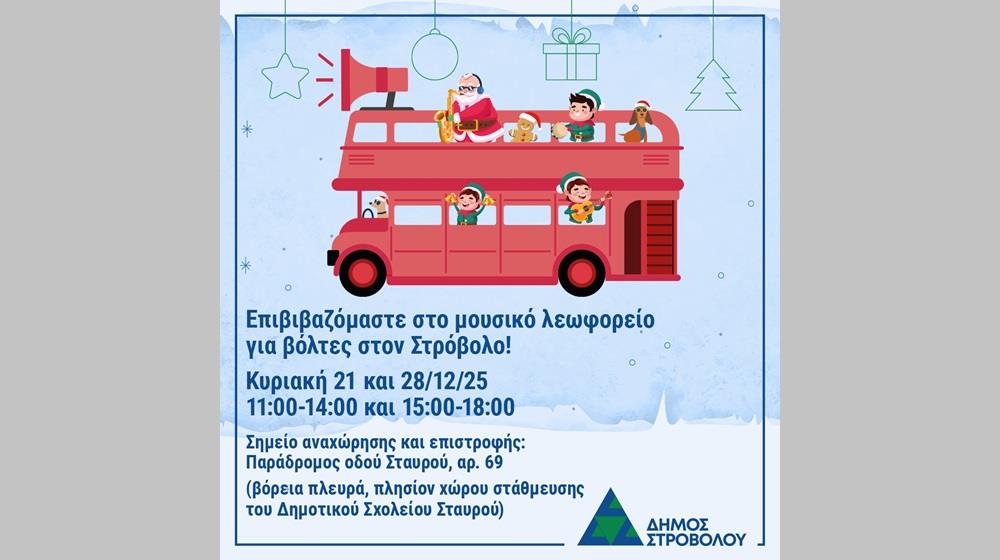 Eπιβιβαστείτε στο μουσικό λεωφορείο για μία αξέχαστη εορταστική εμπειρία στον Στρόβολο, την Κυριακή 21 και 28 Δεκεμβρίου 2025, από τις 11:00-14:00 και 15:00-18:00 (αναχώρηση κάθε 30 λεπτά).