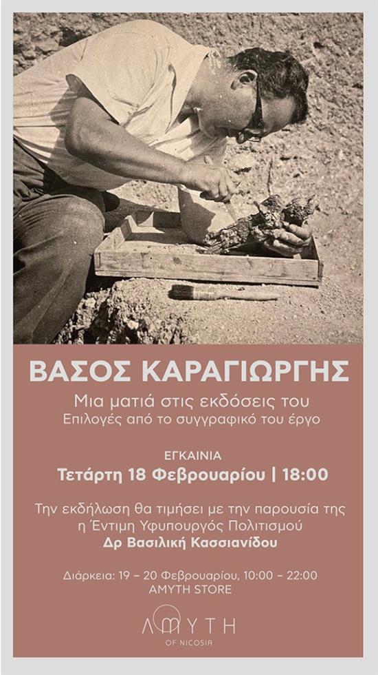 Με αφορμή τα τέσσερα χρόνια από το θάνατο του καταξιωμένου αρχαιολόγου Βάσου Καραγιώργη, ο Όμιλος Thanos Hotels, η διεύθυνση του ξενοδοχείου Amyth και ο επιμελητής του Amyth Store Σάββας Χριστοδουλίδης σας προσκαλούν σε μια γνωριμία με το συγγραφικό του έργο. Οι ογδόντα επιλεγμένες εκδόσεις που παρουσιάζονται στο Amyth Store προέρχονται από το προσωπικό του αρχείο και διατίθενται από την οικογένεια του αποσκοπώντας στην ευρύτερη γνωριμία του κοινού με το έργο του. Οι επιλεγμένες εκδόσεις καλύπτουν μια μεγάλη περίοδο της έρευνας του εκκινώντας με το βιβλίο Chypre (1968) στις εκδόσεις Nagel της Γενεύης μέχρι και το τελευταίο του βιβλίο Με τον Όμηρο στις μέρες του κορωνοϊού (2021) από τις εκδόσεις Καπόν της Αθήνας..