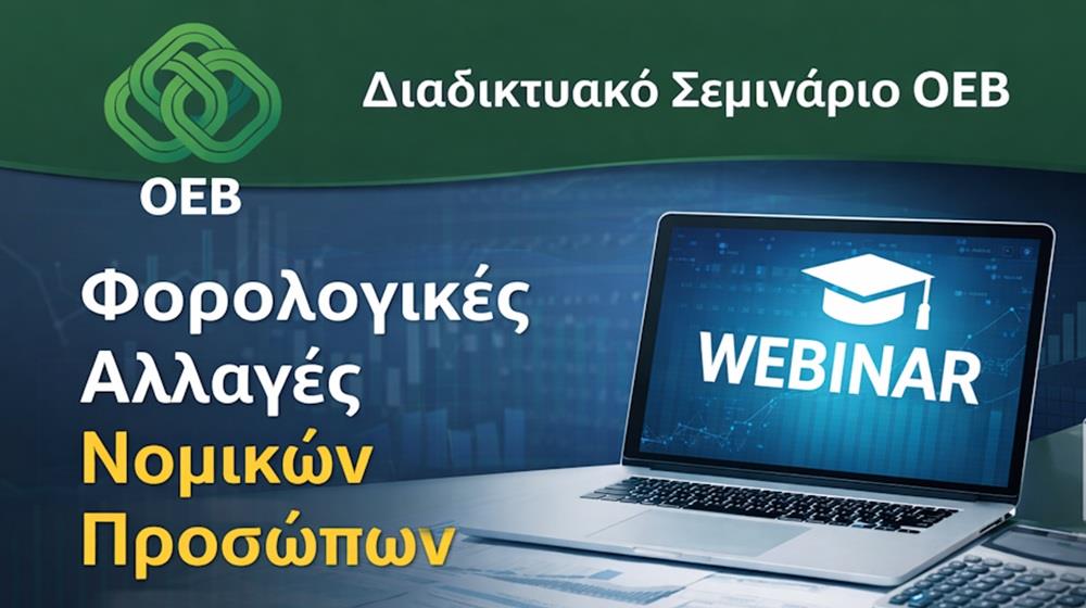 Σε συνέχεια των ενημερωτικών παρουσιάσεων που διενεργήθηκαν για τις φορολογικές αλλαγές που αφορούν τα Φυσικά Πρόσωπα, η Ομοσπονδία Εργοδοτών και Βιομηχάνων (ΟΕΒ) σε συνεργασία με το Γραφείο του Εφόρου Φορολογίας, διοργανώνει ενημερωτικά Webinars για παρουσίαση των αλλαγών που προκύπτουν από την Φορολογική Μεταρρύθμιση και επηρεάζουν τα Νομικά Πρόσωπα.