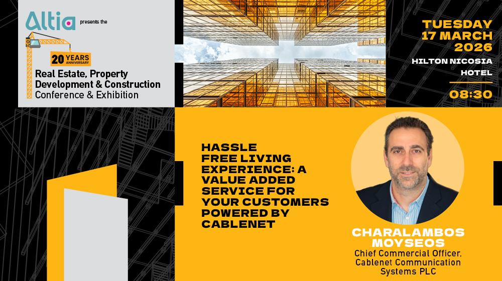 Το θέμα αναλύεται μέσα από την παρουσίαση «Hassle Free Living Experience: A value added service for your customers», στο πλαίσιο του 20ού Real Estate, Property Development & Construction Conference & Exhibition, που παρουσιάζει η Altia στις 17 Μαρτίου 2026 στο Hilton Nicosia. Η ομιλία εστιάζει στο πώς οι developers μπορούν να ενσωματώσουν σύγχρονες τηλεπικοινωνιακές και ψηφιακές λύσεις στα έργα τους, δημιουργώντας ένα ολοκληρωμένο οικοσύστημα υπηρεσιών που ενισχύει την εμπειρία διαβίωσης και τη μακροπρόθεσμη αξία των ακινήτων.